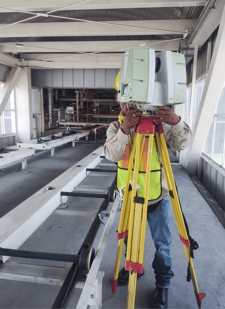 Plomeo de columnas y estructuras metálicas, trazado de ejes y niveles de cimentación, monitoreo de estructuras y levantamientos de obra para proyectos industriales en Puebla y alrededores.